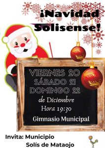 02.12.2019 Desde el viernes 20 de diciembre se celebrará la Navidad Solicense Posted on diciembre 2, 2019diciembre 5, 2019 by Redaccion El Gimnasio Municipal será sede de la Navidad Solicense en este 2019 debido a las obras que se realizan en la Plaza Lázaro Cabrera. Esta actividad será el viernes 20, sábado 21 y domingo 22 de diciembre a las 19:30 horas.